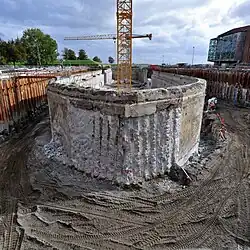 In 2007, Ingels exhibited at the Storefront for Art and Architecture in New York City and was commissioned to design the Danish Maritime Museum in Helsingør. The current museum is located on the UNESCO World Heritage Site of nearby Kronborg Castle.[29] The concept of the building is 'invisible' space, a subterranean museum which is still able to incorporate dramatic use of daylight.[30] In launching the $40 million project, BIG had to reinforce an abandoned concrete dry dock on the site, 150 metres (490 ft) long, 25 metres (82 ft) wide and 9 metres (30 ft) deep, building the museum on the periphery of the reinforced dry dock walls which will form the facade of the new museum.[30] [31] The dry dock will also host exhibitions and cultural events throughout the year.[30] The museum's interior is designed to simulate the ambiance of a ship's deck, with a slightly downward slope. The 7,600 m2 (82,000 sq ft) exhibition gallery is to house an extensive collection of paintings, model ships, and historical equipment and memorabilia from the Danish Navy.[30] Ingels is collaborating with consulting engineer Rambøll, Alectia for project management, and E. Pihl & Søn and Kossmann.dejong for construction and interior design.[29] Some 11 different foundations are funding the project. Construction began on the museum in September 2010 and it is scheduled for completion by the summer of 2013.[30] In September 2012, the Kronborg and Zig-Zag Bridge components to the building were shipped in from China.[30]
