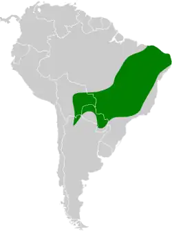 The black-capped antwren is found from Maranhão and Rio Grande do Norte in northeastern Brazil south to Mato Grosso, Mato Grosso do Sul and extreme western Paraná and São Paulo, and into southeastern Bolivia, the northwestern Argentinian provinces of Jujuy and Salta, and northern and eastern Paraguay. It inhabits all levels of several forest types including deciduous, semi-deciduous, evergreen, and gallery forest. In northeastern Brazil it favors caatinga woodland, semi-deciduous mata-de-cipó, and humid evergreen forest. In elevation it ranges from sea level to 800 m (2,600 ft) in most of its range but reaches 1,450 m (4,800 ft) at the base of the Andes in Bolivia and Argentina.[5][6][7]