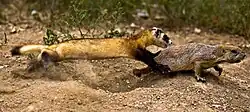 Predators of black-footed ferrets include golden eagles, great horned owls, coyotes, American badgers, bobcats, prairie falcons, ferruginous hawks, and prairie rattlesnakes.[9][23][24]