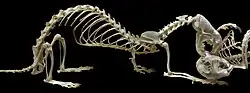 Like its close relative, the Asian steppe polecat (with which it was once thought to be conspecific), the black-footed ferret represents a more progressive form than the European polecat in the direction of carnivory.[4] The black-footed ferret's most likely ancestor was Mustela stromeri (from which the European and steppe polecats are also derived), which originated in Europe during the Middle Pleistocene.[13] Molecular evidence indicates that the steppe polecat and black-footed ferret diverged from M. stromeri between 500,000 and 2,000,000 years ago, perhaps in Beringia. The species appeared in the Great Basin and the Rockies by 750,000 years ago. The oldest recorded fossil find originates from Cathedral Cave, White Pine County, Nevada, and dates back 750,000 to 950,000 years ago.[14] Prairie dog fossils have been found in six sites that yield ferrets, thus indicating that the association between the two species is an old one.[15] Anecdotal observations and 42% of examined fossil records indicated that any substantial colony of medium- to large-sized colonial ground squirrels, such as Richardson's ground squirrels, may provide a sufficient prey base and a source of burrows for black-footed ferrets. This suggests that the black-footed ferret and prairie dogs did not historically have an obligate predator–prey relationship.[14] The species has likely always been rare, and the modern black-footed ferret represents a relict population. A reported occurrence of the species is from a late Illinoian deposit in Clay County, Nebraska, and it is further recorded from Sangamonian deposits in Nebraska and Medicine Hat, Alberta. Fossils have also been found in Alaska dating from the Pleistocene.[15][13]