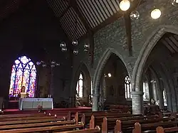 The nave leads to the altar below the tower. At the end of the South transept is the large stained glass window known as the "Rosary Window", which is composed of five "lights" or great vertical panels, and is the largest stained glass window in Ireland.[2] This window was created in 1892 by Mayers of Munich, and depicts the Mysteries of the Rosary.[4]