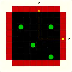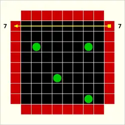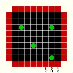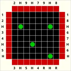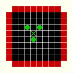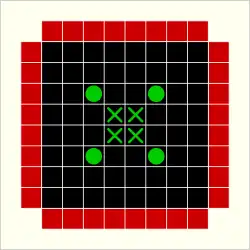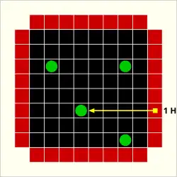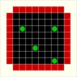 The most common variant of Black Box is played on an 8×8 grid with five (or more) atoms. Five-atom configurations allow for positions that cannot be unambiguously determined by probes. The grid at left shows an example of this.