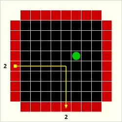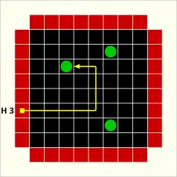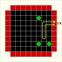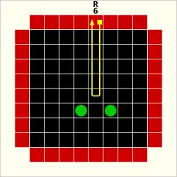 The final type of interaction of a ray with an atom is a "reflection", designated by an "R". This occurs in two circumstances. If an atom is at the edge of the grid, any ray which is aimed into the grid directly beside it causes a reflection.
