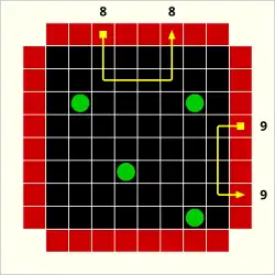 There are 32 input positions in an 8×8 grid, eight each at the top, bottom, right, and left. A beam is "fired" into one of these positions and the result is used to help deduce the location of a known number of hidden atoms.