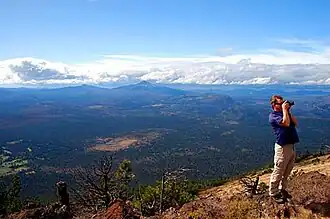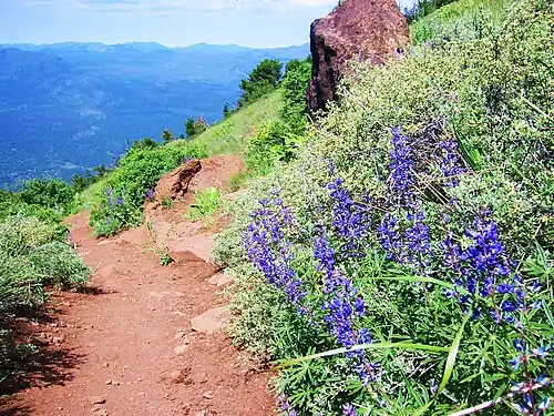 Black Butte lies east of the major crest of the Cascades, which is more arid compared to the Western Cascades.[18] Two forest populations at Black Butte were analyzed in a 1975 study conducted by D. B. Zobel of Oregon State University. These forest areas included ponderosa pine and tree species intermediate to grand and white firs.[18] The study found that trees at Black Butte did not experience significant moisture stress[19] and that photosynthesis rates during dry summer seasons were more reduced at tree sites in the Western Cascades compared to at Black Butte.[20] Black Butte was found to have a shorter growing season and less favorable winter temperatures for photosynthesis at its forest sites than study areas in the Western Cascade Province.[20] Along the trail that runs up Black Butte, the forest is diverse, with yellow-bellied ponderosa pines, mixed conifers, and subalpine vegetation.[21]