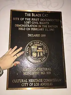 In November 2012 the site became a restaurant and bar named The Black Cat in memory of the earlier establishment. The new Black Cat caters to a general clientele, and there are photographs of the events of 1967 displayed inside.[28] In 2008, the city of LA Cultural Heritage Commission installed a plaque on the building where the original Black Cat Tavern resided, recognizing it as the site of the first LGBTQ civil rights demonstration in the nation.[29] In 2021, the ANSWER Coalition organized a march that started at the original Black Cat Tavern. The march advocated for an end to police brutality, racism, homophobia and transphobia and for gay rights. The Tavern was chosen for the starting point because it is widely considered to be the first site of protest for gay rights.[30] On October 1, 2023, the Black Cat Tavern became California Historical Landmark #1063, with a marker designating it as such being unveiled, which made it the first marker for a California Historical Landmark associated with LGBTQ history.[31]