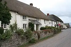 The village is on one of the highest ridges of land between Dartmoor and Exmoor, at an altitude of 656 feet.[1] It enjoys views to both moors, but particularly of Dartmoor from the pub, now closed, the Black Dog Inn, which was a favoured watering hole for walkers on the 'Two Moors Way'. Black Dog is split between the civil parishes of Washford Pyne and Woolfardisworthy.