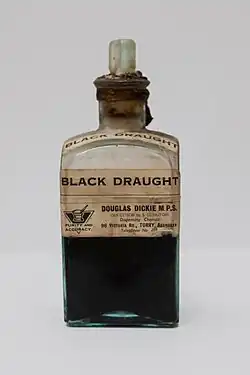 Black draught (Latin: Haustous) was a patent medicine used as a purgative in the 19th century and well into the early part of the 20th century, with veterinarians prescribing these to constipated cattle and horses. It is a saline aperient mixture used along with blue mass.
