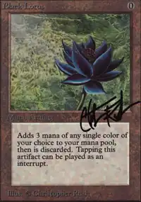 Christopher Rush illustrated the card's art.[2] Black Lotus was printed for the earliest core sets of Magic: The Gathering, the Limited Edition Alpha and Beta sets, and the Unlimited set, which were all released in 1993.[3][4] The Alpha and Beta editions had black borders, and the Unlimited edition had white borders.[5]: 52 The Black Lotus is an artifact card that players can put into play for free, since it requires zero mana to cast. Players can sacrifice (discard it from play) to add three mana of one color to their mana pool.[5]: 52 Since a deck may contain four copies of any non-land card, a player could have four Black Lotus cards in their deck, providing a significant advantage in the early stages of the game.[3]