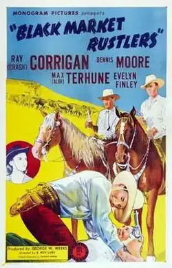 Black Market Rustlers is a 1943 American Western film directed by S. Roy Luby and written by Patricia Harper. The film is the twenty-third in Monogram Pictures' "Range Busters" series, and it stars Ray "Crash" Corrigan as Dusty, Dennis Moore as Denny and Max Terhune as Alibi, with Evelyn Finley, Steve Clark and Glenn Strange. The film was released on August 27, 1943.[1][2][3]