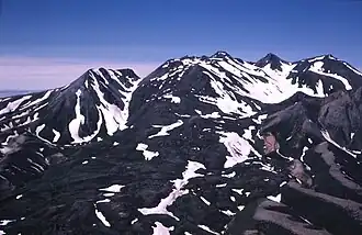 Black Peak is a highly eroded stratovolcano comprising a lava dome complex on the Alaska Peninsula of the U.S. state of Alaska.[3] Also called Purple Crater,[4] Black Volcano or Sopka Chornaia, the mountain is located within the Lake and Peninsula Borough.[2]