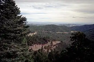 The southern portion of the Black Range, which are also known as the Mimbres Mountains, was occupied by the Mimbres people whose culture peaked about 1000 C.E. and ended about 1150 C.E.[2] Their most famous site is the Gila Cliff Dwellings. Silver was discovered in the Black Range in the late 1870s, first in 1876 at Lake Valley,[3] and then by Harry Pye in 1879 at Chloride.[4][5] This led to a silver rush,[4] and silver and gold mines flourished in the Black Range through the end of the 19th century.[5]