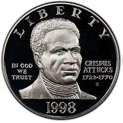The obverse of the coin features Crispus Attucks, a dockworker and freed slave who is generally considered to be the first man killed in the Boston Massacre.
