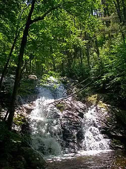 Most public access comes from Route 9W, near the lowest portions of the land, and many of the research and educational facilities are located in that north central area. To the south, in the Highlands portion of the forest, the land rises over a thousand feet (300 m) to several peaks, including the eponymous 1,402 foot (427 m) Black Rock with its observation tower and Spy Rock, at 1,463 feet (446 m)[7] the highest point in the Town of Highlands and the highest peak in the Highlands west of the Hudson River.[1][8] There are seven water bodies in the forest,[7] all of which form part of the village of Cornwall-on-Hudson's water supply system excepting Sutherland Pond.[9] The ponds drain into an unnamed stream that crosses the village and empties into Moodna Creek near where it joins the Hudson; Sutherland gives rise to Mineral Springs Brook, which flows out to the scenic Mineral Springs Falls near the western end of the forest and then to Moodna Creek's main tributary, Woodbury Creek.