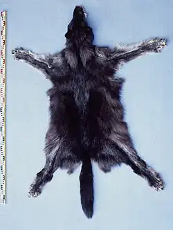 Although the black wolves of America were originally given the same binomial name as those in Europe, Anselme Gaëtan Desmarest believed that they were a different species.[15] Historically, the natives of the banks of the Mackenzie River, Saskatchewan River and southern Canada apparently never viewed black wolves as a distinct species.[16] In his 1791 book Travels, William Bartram mentioned seeing black wolves among the few red wolf populations he saw in Florida. He stated that they were "perfectly black", except the females which were described as having a white spot on the breast. Bartram also described a "black wolf-dog of the Florida Indians" which was identical to the local wolves, save for the fact that it could bark, and could be trusted around horses.[5] The fur of a black wolf was once considered by the natives of New England to be worth over 40 beaver skins. A chieftain accepting a gift of black wolf fur was seen as an act of reconciliation.[17] The black wolves of the Southern United States were considered a separate species to the northern kind due to differences in colour and morphology, and were named dusky or clouded wolves (Canis nubilus).[4][18] The dusky wolves occurred in the Missouri Territory, and were intermediate in size between common wolves and coyotes. They apparently produced a foul odour.[19] On January 15, 2009, a male black wolf from "Mollie's Pack" in the Yellowstone National Park's Pelican Valley was weighed in at 143 lbs, making it the largest Yellowstone wolf on record.[20]