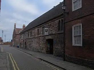 Blackfriars Theatre and Arts Centree is Grade II* listed. The two-storey building was the refectory of a Dominican friary that was "heavily restored and altered" in 1963 when an eastern gable was rebuilt with casement windows added. The interior retains a 17th-century staircase, although not in its original position.[1] Pevsner describes the building as a 90 feet (27 m) long "Friars Hall", running on an east to west axis with its upper floor previously the refectory.[2] At the Suppression of the Monasteries material from the Friary was used to repair sea walls.[3]