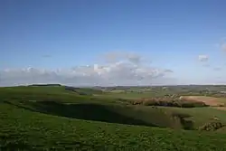 To the east and north the view is interrupted by low limestone hills, and, occasionally, hills like Duncliffe rise dramatically from the plain. The Frome valley in the north is thinly populated, settlements and parks on the valley sides looking down on arable farmland. In the east along the Vale of Wardour, settlement increases and arable farming is also more prevalent here.[2]