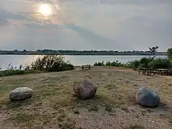 Blackstrap Lake is a man-made lake that was created in 1967 as a water reservoir for agricultural, industrial, and recreational uses. Saskatoon was awarded the 1971 Canada Winter Games and land was acquired along the reservoir to build a man-made mountain, Mount Blackstrap, for the downhill events. In 1986, much of the eastern shore of the lake, including Mount Blackstrap, became the provincial park.[3] Water used to flood and maintain the lake is gravity fed via an earthen aqueduct from Lake Diefenbaker. Local legend claims that the name for the region is derived from an incident involving the breaking of a barrel of blackstrap molasses during transport through the valley, thereafter becoming known as Blackstrap.[4]