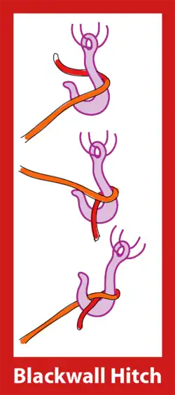 The blackwall hitch is a temporary means of attaching a rope to a hook. Made of a simple half hitch over the hook, it will only hold when subjected to constant tension. It is used when the rope and hook are of equal size, but it is likely to slip if subjected to more than ordinary tension. Human life should never be trusted to it.[1]