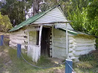 In March 1855 reports began to appear in the colonial press of a "new gold-field at Mount Blackwood", considered to be an "ample field for profitable employment".[4] By the following July it was reported that the Mount Blackwood diggings were "in a most flourishing state". There were two public houses ("I believe, well conducted") and a theatre in the course of construction, as well as a "horse bazaar by Mr. Waller" ("who seems an enterprising man"). The Government "are building a log prison for the unruly".[5] A Post Office opened at Mount Blackwood in September 1855 (in a building known today as 'Blackwood House')[6] The prospectors at the new goldfield initially searched for alluvial gold, panning the creeks and sluicing the stream-banks and hillsides. Towards the end of 1855 the Mount Blackwood goldfield had an estimated population of 13,000 inhabitants.[7]