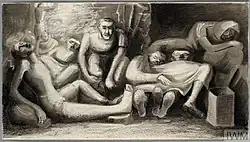At the start of the Second World War, Hughes-Stanton, like many other artists, undertook camouflage work before he enlisted in the British Army.[10] In 1940 he joined the Royal Engineers. He served in the Middle East and then transferred to Greece, where he was captured. An overzealous prison guard in the temporary POW camp at Corinth shot him in the throat and skull when he strayed too close to the camp wire. His injury incapacitated him and he was moved to a series of camps in Germany, and he was finally repatriated to Britain in August 1943. Back in England he wrote to the War Artists' Advisory Committee (WAAC) in November 1943, seeking a painting commission. After a meeting with Kenneth Clark, the chairman of WAAC, he was given a commission to paint three pictures based on his experiences as a POW. After Blair-Stanton completed these, WAAC purchased two more pictures from him.[11]