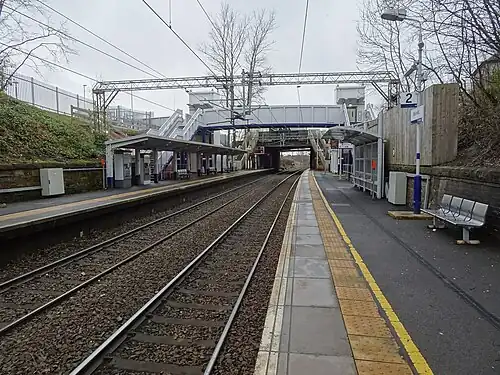 The street-level platform, which now bears the "portacabin" ticket office, once supported a wooden station building which housed a ticket office and newsagent. On the night of 12 January 1987, shortly after being painted in the bright orange livery of the Strathclyde Passenger Transport Executive, this building was burned to the ground. The station now has a staffed ticket office during working hours (Monday-Saturday). A new purpose built car park on the site of the former St. Ambrose High School now serves the station.[2]