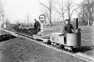 The main line was used from 1942 to about 1944 with manually pushed V-skip trucks to transport coke to the estate's power plant. Around 1946, the remnants of the line were dismantled and the trucks scrapped. When Sarah, the second wife of Charles William Bartholomew, with whom he had the children Ivy and James, moved to her son's house in Norfolk in 1947, the furniture and other contents of the manor house were auctioned off. The property was initially sold to the Hesketh family in 1949, but subsequently changed ownership several times. Sarah died in 1953 at the age of 89 years.[2] After Blakesley Hall had fallen into disrepair for over ten years, it was demolished in 1957.[1]