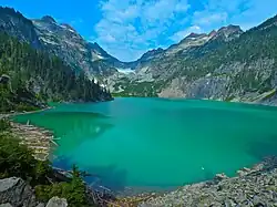Blanca Lake sits in a basin surrounded by the peaks of Monte Cristo, Kyes, and Columbia. The lake is fed by the Columbia Glacier to the northwest and is drained by Troublesome Creek, a tributary of the North Fork Skykomish River.[3] The glacier's cold, silt-filled melt water is what makes the lake a spectacular turquoise green color[4] making this a prime example of a rock flour lake.