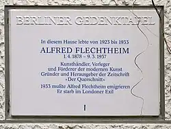 - Bleibtreustraße 15: Alfred Flechtheim, art dealer, publisher and promoter of modern art; founder and editor of the magazine Der Querschnitt, lived here between 1923 and 1933. In 1933 his art dealership was Aryanized by Nazis and he emigrated to London where he died.[10]