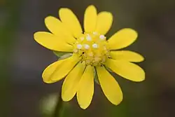 This is a small annual herb under 30 centimeters tall. The leaves are 5 to 15 centimeters long and linear in shape with lobes near the ends. The inflorescence bears a few flower heads. Each head contains a center of yellow disc florets, some of which bear prominent white stigmas and white pollen. Around the edge of the head is a fringe of yellow ray florets with red stigmas. The fruit is an achene a few millimeters long which becomes sticky when wet.
