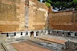 The complex, measuring 11 m by 22 m, consists of three rooms arranged on an east-west axis: frigidarium, tepidarium, and caldarium.[B 3] The last two rooms are equipped with an underfloor heating system.[E 1] Preceding these rooms to the east is a small reception area. The frigidarium, ending in an apse, features a brick basin filled with cold water.[B 3] The caldarium, also with an apse, contains a basin filled with hot water.[B 3] The rectangular tepidarium[E 1] follows a design typical in Campania, particularly in Pompeii, with the bathtub positioned on the north wall next to the hearth, and a sprinkling basin on the same wall.[E 3]