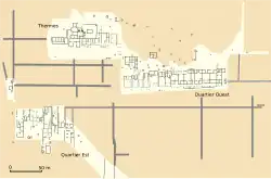 The monumental thermal complex is a testament to the significance of this primarily artisanal settlement. It is constructed on a north-south axis[E 1] and spans 75 meters in length by 35 meters in width.[F 4] The construction is part of a "global urban development plan for the settlement," with a 3.50-meter-wide paved street running along its southern part.[C 11]