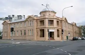 Built to the street alignment, the building is composed of three main parts, a truncated corner structure and two flanking wings arranged in an L-shaped plan. The classical design of the facade is evident in the regular arrangement of windows, varied roofline of pediments and domes and classical detailing in balustrades and mouldings. The symmetrical composition emphasises the corner location. The external walls of the building are brickwork, rendered and painted where visible from the street.[1]
