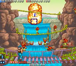 The player's characters are seen from behind. Some screens feature protective walls (which can get damaged and shattered by enemy fire). The players have limitless ammunition for their primary gun, but a limited number of sticks of dynamite, with which they must fend off enemy troops. An enemy gauge at the bottom of the screen depletes as foes are destroyed and certain structural features of the screen (usually the ones that collapse when destroyed, rather than simply shattering) are brought down. At the successful completion of a level by fully depleting the enemy gauge, all the remaining buildings on-screen collapse and the player progresses to the next stage, reprising the amusing "victory dance walk" into the horizon from Cabal. Boss fights, however, start from the beginning if a player dies.