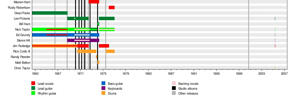 - Nick Taylor — rhythm guitar (1962–1974, 1974–1976, 2005; died 2010), lead guitar (1972–1974), lead vocals (1965–1968), backing vocals (1969–1973, 1974–1976, 2005)