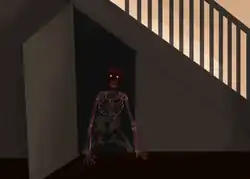 An artistic depiction of Bloody Bones under stairs