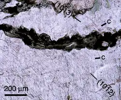 A photomicrograph of the granitic rock near the crater. The parallel lines throughout the thin section are diagnostic of shock metamorphism