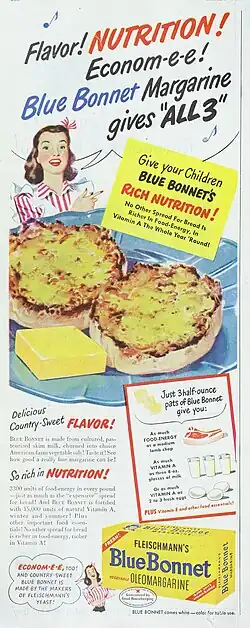 Blue Bonnet is an American brand of margarine and other bread spreads and baking fats, owned by ConAgra Foods.[1] Original owner Standard Brands merged with Nabisco in July 1981, but Nabisco ultimately sold Blue Bonnet to ConAgra, along with a number of other food brands, in 1998.