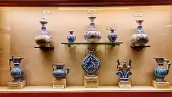 Blue pottery is widely recognized as a traditional craft of Jaipur of Central Asian origin.[1] The name 'blue pottery' comes from the eye-catching cobalt blue dye used to colour the pottery. It is one of many Eurasian types of blue and white pottery, and related in the shapes and decoration to Islamic pottery and, more distantly, Chinese pottery.