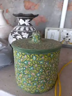 Being fired at very low temperature makes them fragile. The range of items is primarily decorative, such as ashtrays, vases, coasters, small bowls and boxes for trinkets. The colour palette is restricted to blue derived from the cobalt oxide, green from the copper oxide and white, though other non-conventional colours, such as yellow and brown are sometimes included.[5] The products made include plates, flower vases, soap dishes, surahis (small pitcher), trays, coasters, fruit bowls, door knobs, and glazed tiles with hand painted floral designs. Sometimes, designer pieces for display are also made. The craft is found mainly in Jaipur, but also in Sanganer, Mahalan, and Neota.[6]