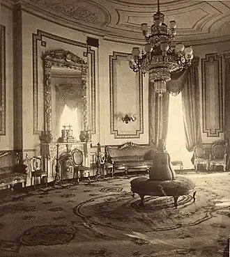 - ^ Boudin used the same white-striped wall covering and blue continuous valance in his design of the Music Room at Munich Residenz, the former royal palace of the Bavarian monarchs in Munich, Germany. He may have drawn inspiration for both rooms from late 18th and early 19th-century paintings and a description of Dolley Madison's parlor at the White House.[23]