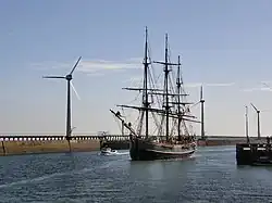 The Quayside has also seen much redevelopment and has been transformed into a peaceful open space, the centrepiece of which is a sculpture commemorating the industry that once thrived there. On the opposite side of the river are the nine wind turbines of the Blyth Harbour Wind Farm, which were constructed along the East Pier in 1992. They were joined in 2000 by Blyth Offshore Wind Farm, which consisted of two turbines situated 1 kilometre (0.62 mi) out to sea. These were the first two offshore wind turbines in the UK. These wind turbines were all decommissioned, with the final two being removed in 2019. A new windfarm further off the coast, composed of five turbines, was commissioned in 2017.