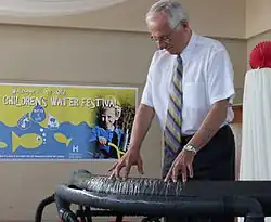 Mayor and musician Bob Bratina playing hydraulophone at the Hamilton Children's Water Festival, May 30, 2012