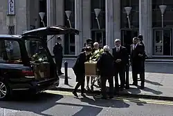 Jones's coffin arriving for the memorial service at the Civic Hall, Wolverhampton