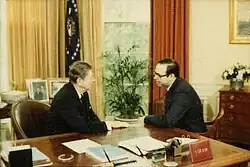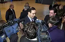 In early 2004, Taft's approval rating showed signs of recovery at 47 percent.[77] In early 2005, when the Coingate scandal was revealed, Taft's approval rating slumped to 34 percent, which was at the time the second lowest approval rating found for an Ohio governor.[78] In late 2005, after his conviction for his involvement in the scandal, polls found the governor had an approval rating of just 15 percent—the lowest approval rating ever found for an Ohio governor.[79] Other polls found that Taft's approval rating was even lower at 6.5 percent, according to Zogby, giving him quite possibly the lowest polled approval rating ever by a United States politician.[80] A SurveyUSA poll that same month gave Taft a rating of 18 percent. In a response, a spokesman for Taft told the Associated Press, "the governor doesn't govern by the polls, he governs by good public policy and making a difference for Ohioans".[81] A late-2005 article in Time named Taft as one of the three worst governors in the country.[82]