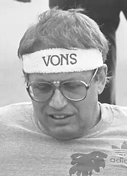 In November 1986 he completed the New York City Marathon, taking four days to complete the 26 miles (42 km) race.[3] He "ran" across America on his hands, taking three years, eight months, and six days to travel from coast to coast and raise money for Vietnam war veterans.[4] In 1988 at 41, he finished the Los Angeles Marathon, taking 74.5 hours to finish the 26.2 miles (42.2 km) race. He started the race a day earlier than everyone else and finished two days after the last runner had crossed the finish line.[5]