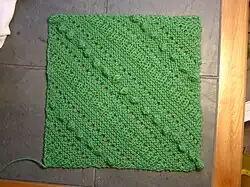 In knitting, a bobble is a localized set of stitches forming a raised bump. The bumps are usually arranged in a regular geometrical pattern (e.g., a hexagonal grid) or may be figurative, e.g., represent apples on a knitted tree.