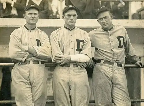 In early September, Veach was purchased by Detroit from Indianapolis.[5] He was promptly inserted into the Tigers' lineup, replacing Davy Jones as the left fielder in an outfield that included future Baseball Hall of Famers Ty Cobb and Sam Crawford. Veach made his major league debut on September 6, 1912, at age 24. He appeared in 23 games for Detroit in 1912, compiling a .342 batting average in 79 at bats.[7] Veach remained the Tigers' starting left fielder for 12 years.[7]