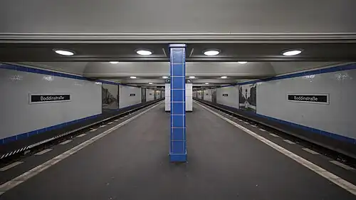 Boddinstraße is a Berlin U-Bahn station located on the U8. It is located below Hermannstrasse at the intersection of Boddinstrasse in the Neukölln district. The station, opened in 1927, is one of the oldest on the line and is operated by the Berlin Transport Company (BVG) under the abbreviation Bo. The station's name comes from Hermann Boddin, mayor of the community from 1874 to 1907 and later the mayor of Rixdorf, today's district of Neukölln.[2]