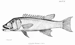 The strong sharp teeth provide evidence of its diet as a benthic predator, and this is confirmed by the stomach contents which include fragments of shells and other coarse calcareous debris as well as detritus.[5] Other large carnivorous fish dwelling in the kelp forest include the Peruvian morwong (Cheilodactylus variegatus), the Chilean sandperch Pinguipes chilensis, the sea chub Graus nigra, and the cabrilla (Sebastes oculatus).[6] These fish are preyed on by the marine otter (Lutra felina) and the South American sea lion (Otaria flavescens).[6]